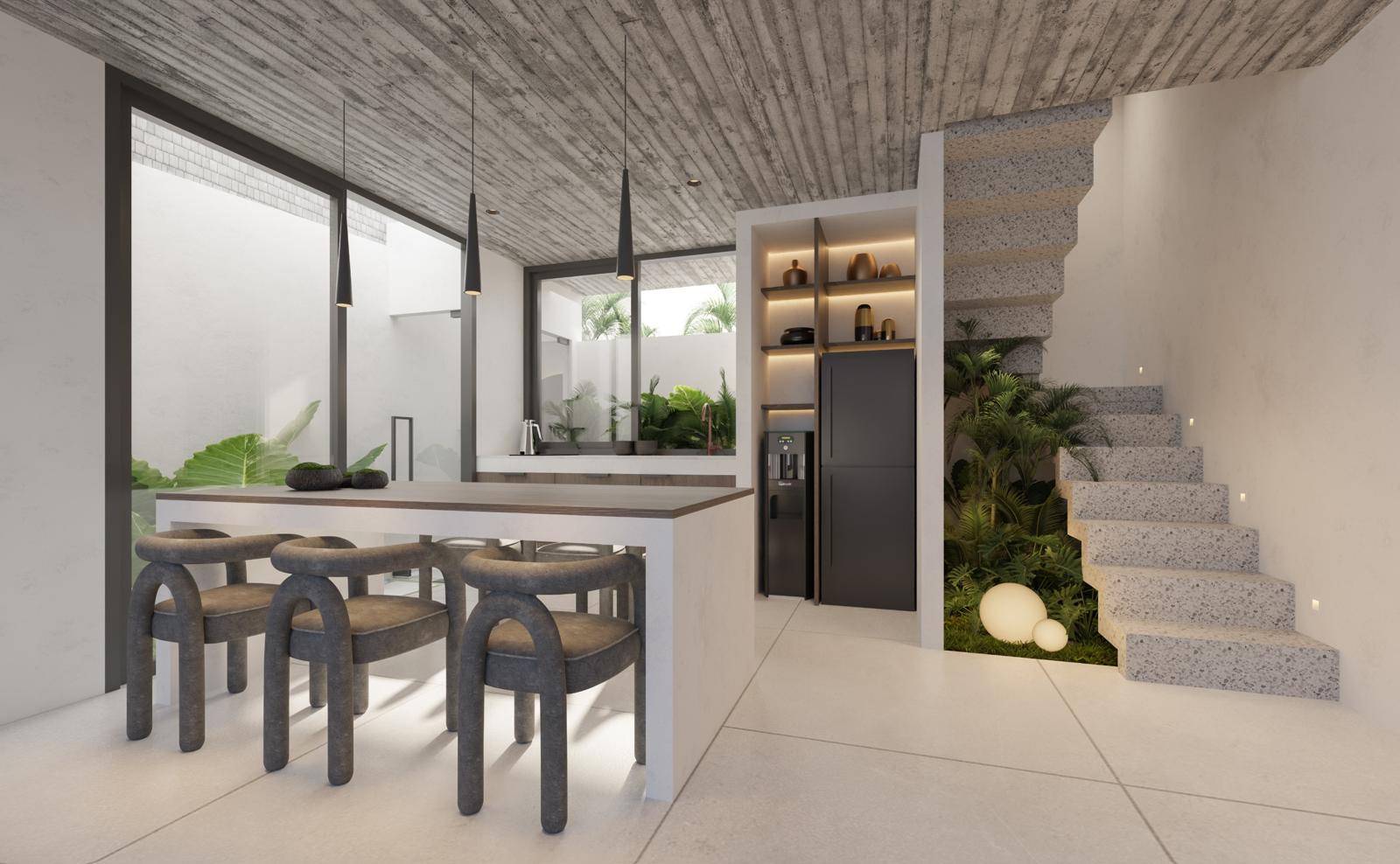 Each villa is designed for modern luxury, with options for 1-bedroom (2 floors) and 2-bedroom (3 floors) units. The location is unbeatable, offering a calm residential environment while being only 5 minutes to the beach and a quick 2-3 minute drive or walk to the island’s best restaurants, shops, and sports clubs.