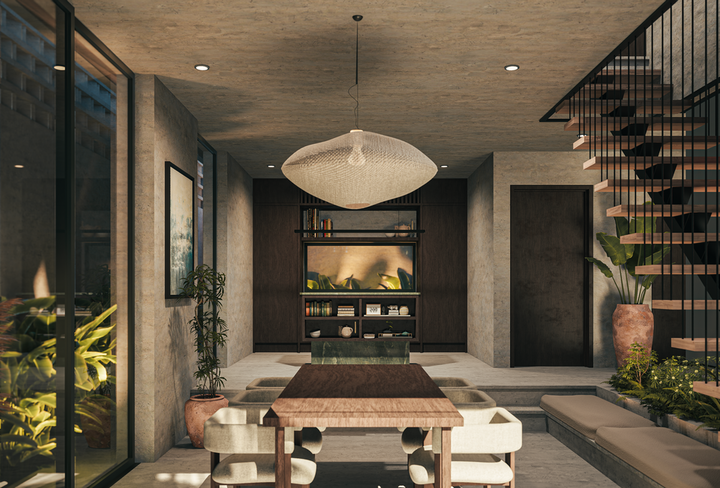 Each villa is a bold architectural statement where raw concrete and stone foundations are softened by warm timber, linen, and lush greenery. The result is a seamless balance between strength and stillness, sculpted to frame light, air, and the surrounding landscape.